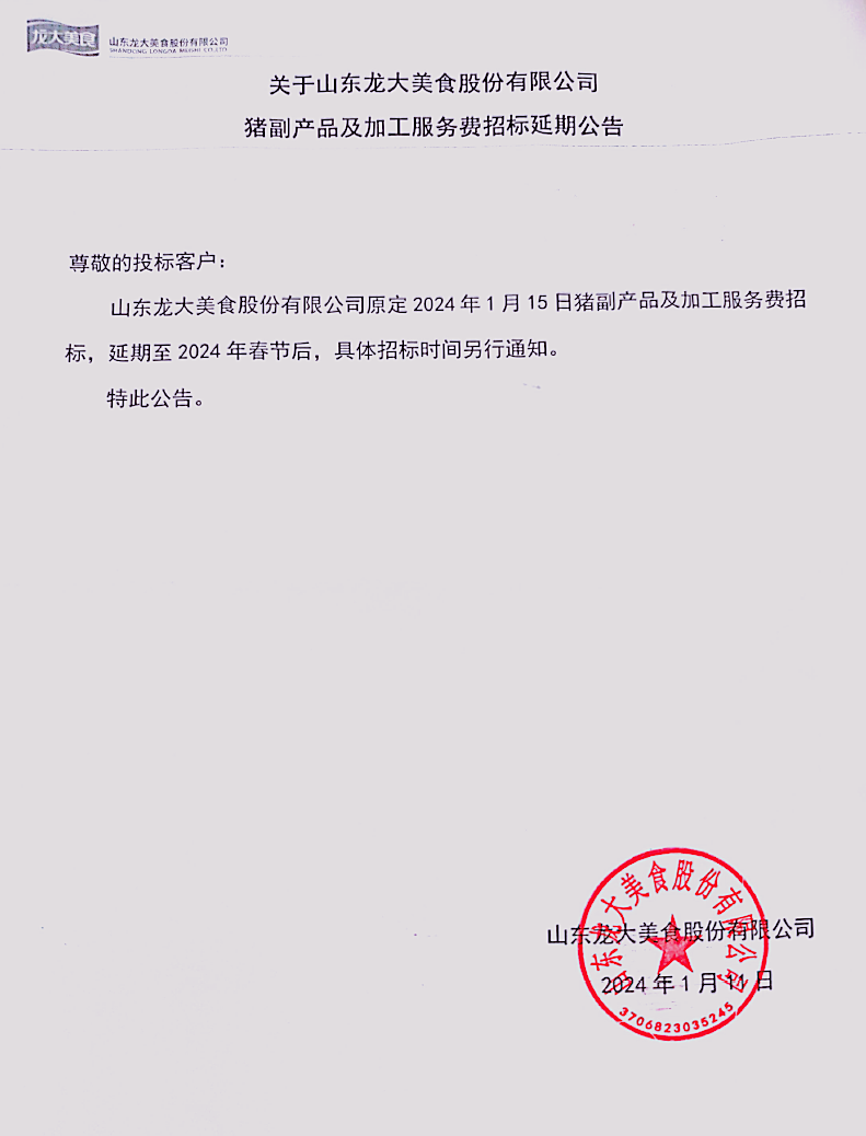 艾尚体育官网原定2024年1月15日猪副产品及加工服务费招标,延期至2024年春节后,详细招标时间另行通知。